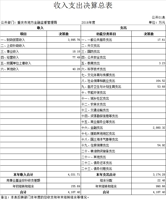 1. 总体情况。本部门2018年度收入总计4,187.40万元,支出总计4,187.40万元。收支较上年决算数增加1,671.95万元、增长66.47%,主要原因:一是因工资调标、发放退休一次性补助及死亡抚恤金等政策性因素,基本支出增加;二是承办全市金融工作会、中新金融峰会等专项工作,项目经费增加;三是下属事业单位政策研究、人才培训等经营收支减少。本部分的收入总计包括收入合计、用事业基金弥补收支差额、年初结转和结余,支出总计包括本年支出合计、结余分配、年末结转和结余。