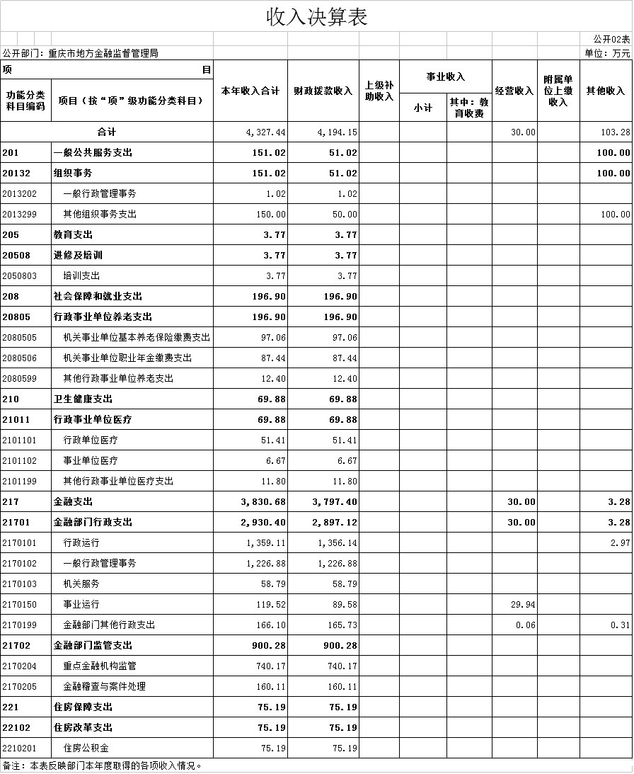 1.收入情况。2021年度一般公共预算财政拨款收入4,194.15万元,较上年决算数减少355.52万元,下降7.8%。主要原因:一是职务正常晋升等形成基本支出增加;二是减少办公用房购置资金等项目支出。较年初预算数增加526.14万元,增长14.3%。主要原因是年中追加补缴职业年金、目标考核奖、人才开发专项资金、小贷系统迁云资金等。此外,年初财政拨款结转和结余765.23万元。