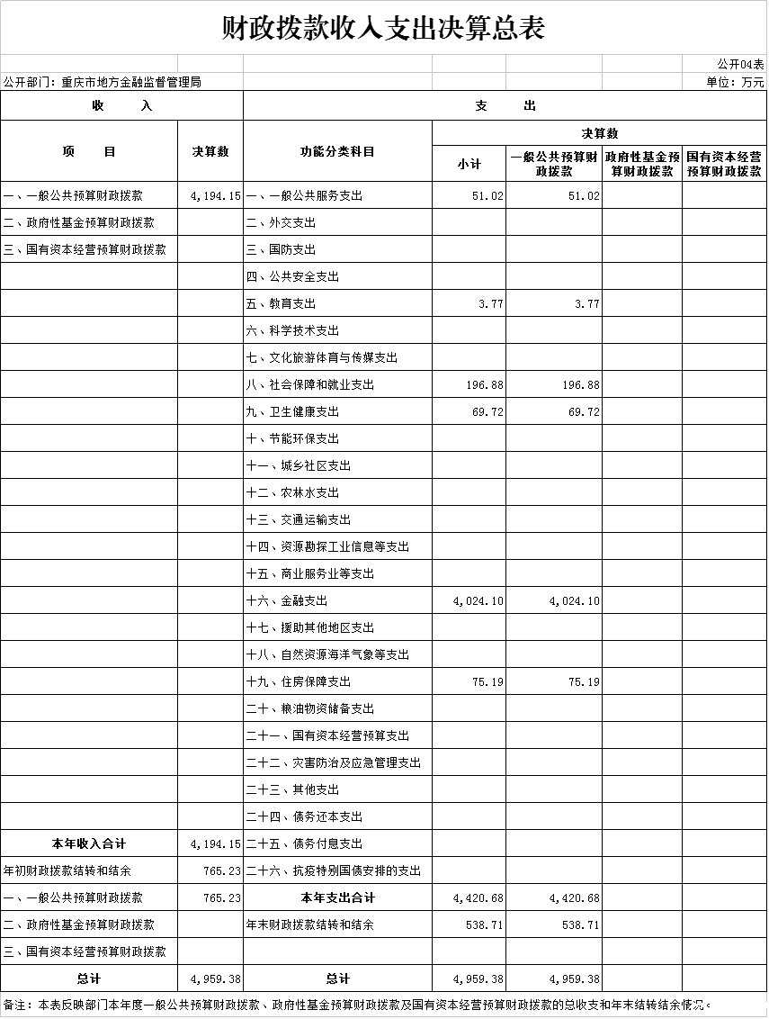 2021年度财政拨款收、支总计4,959.38万元。与2020年相比,财政拨款收、支总计各减少99.14万元,下降2%。主要原因:一是本年度财政拨款收支同比减少355.52万元,主要是减少办公用房购置等项目支出;二是年初财政拨款结转资金同比增加256.38万元,主要是增加了地方综合监管平台建设项目资金。