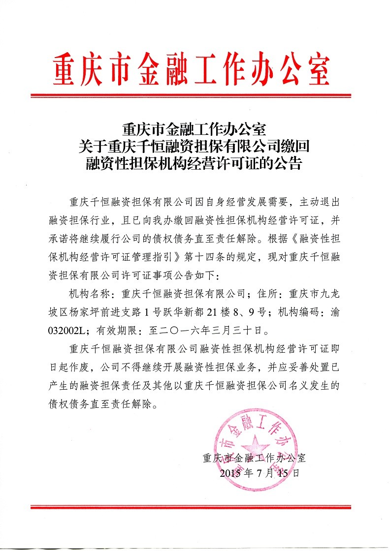 重庆市金融工作办公室关于重庆千恒融资担保有限公司缴回融资性担保机构经营许可证的公告