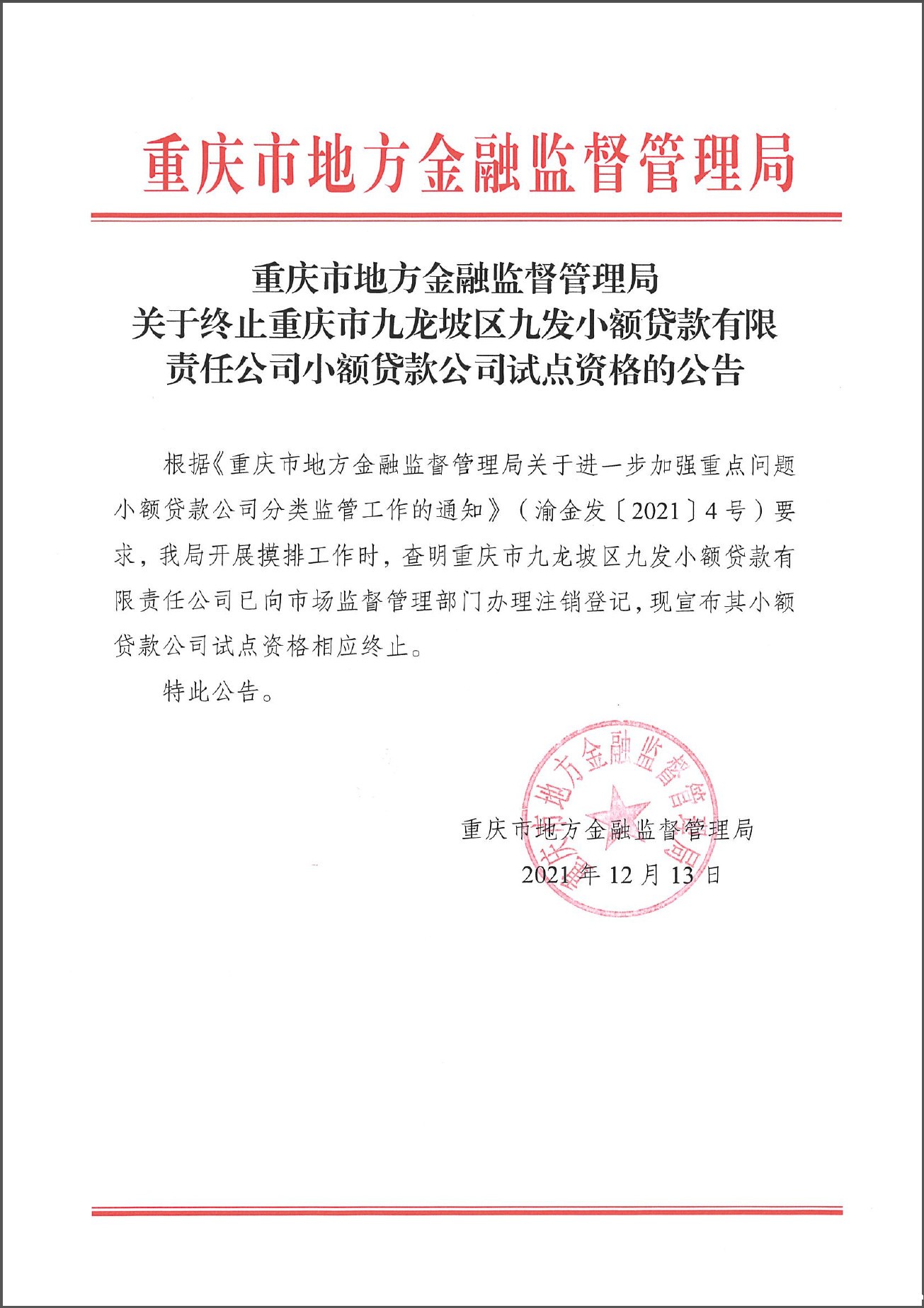 2026美加墨世界杯赛程表关于终止重庆市九龙坡区九发小额贷款有限责任公司小额贷款公司试点资格的公告
