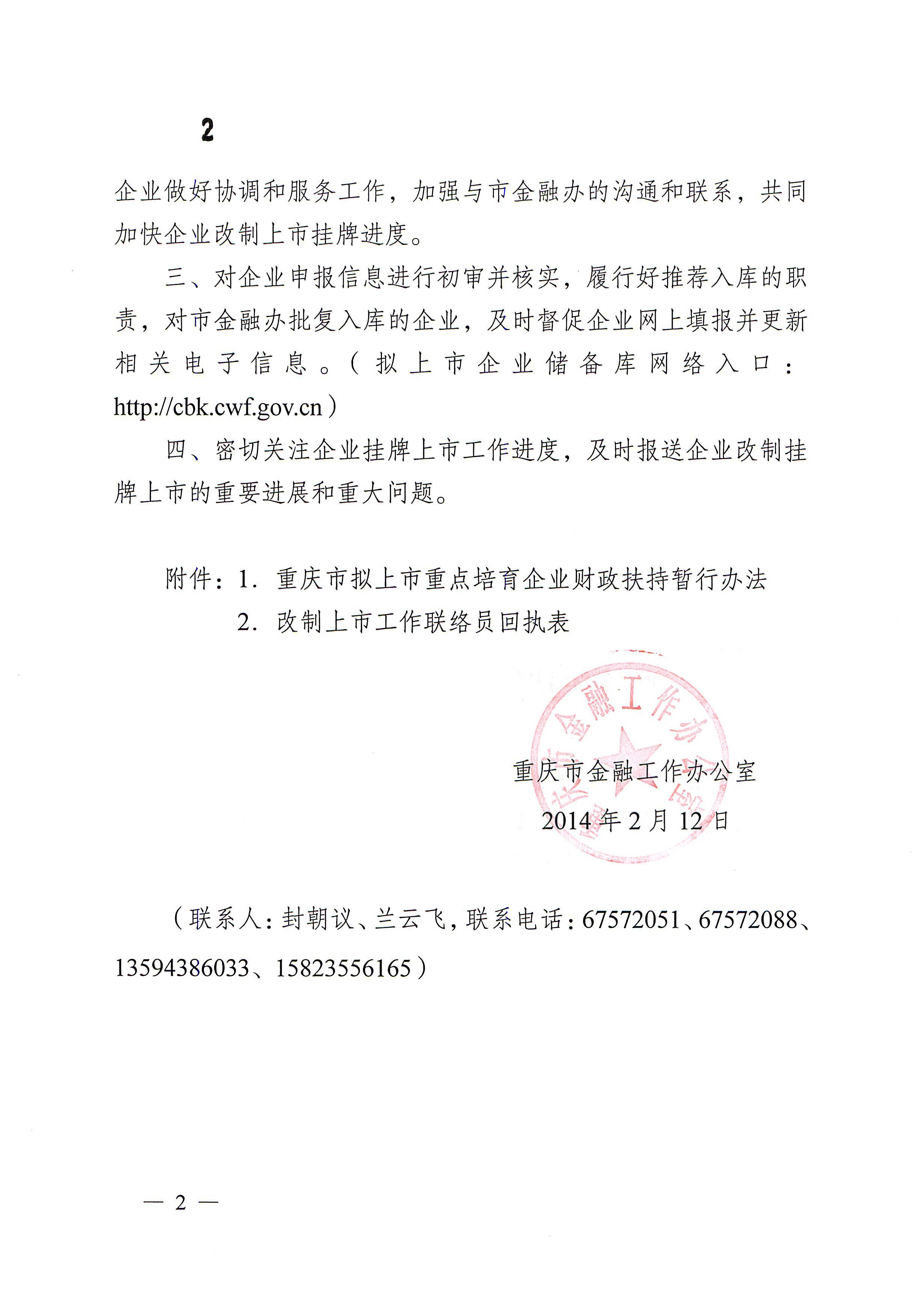 附件:《重庆市金融工作办公室关于实施重庆市拟上市重点培育企业财政扶持暂行办法的通知》(渝金发〔2014〕1号)