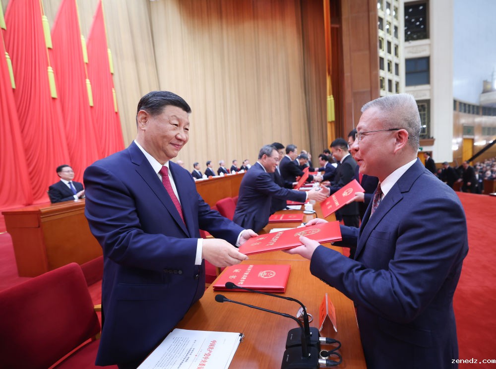 6月24日,全国科技大会、国家科学技术奖励大会和中国科学院第二十一次院士大会、中国工程院第十七次院士大会在北京人民大会堂隆重召开。中共中央总书记、国家主席、中央军委主席习近平向获得2023年度国家最高科学技术奖的武汉大学李德仁院士颁奖。新华社记者 鞠鹏 摄
